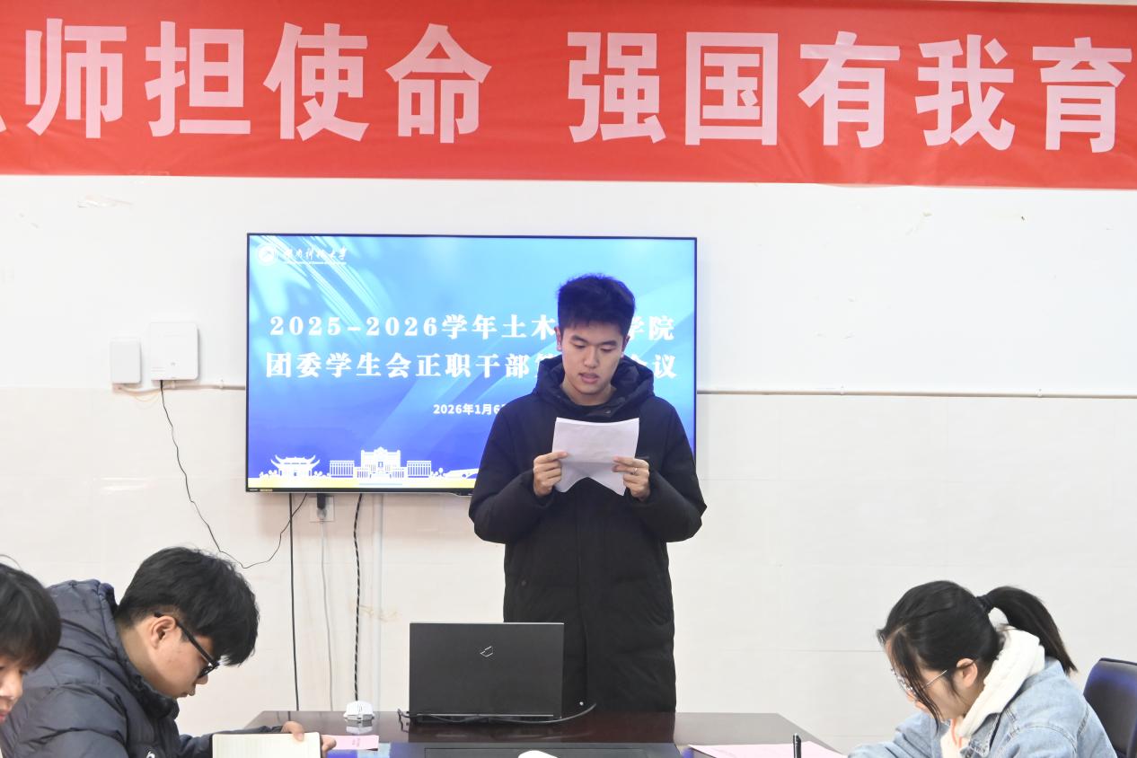 2026年1月6日上午10时,学院团委学生会正职干部第二次会议于土木楼230会议室召开。会议由主席团成员王浩力主持,学工办主任周姣术、团委书记刘芯竹及学院团学组织相关正职干部出席本次会议。